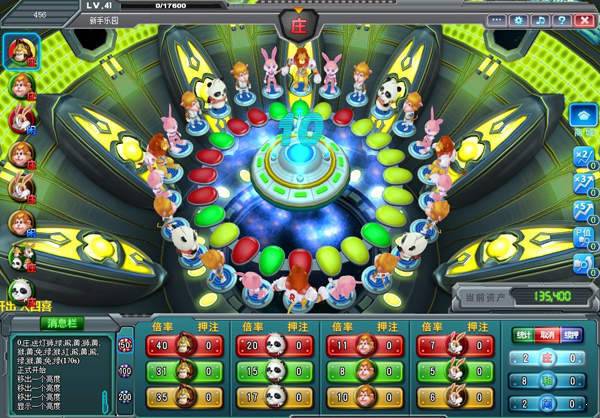 押狮子、熊猫、猴子、兔子中的一种,同时还需要选择三种颜色:红、黄、绿中的一种,每种动物有不同的倍率,狮子倍率最高,兔子倍率最低。