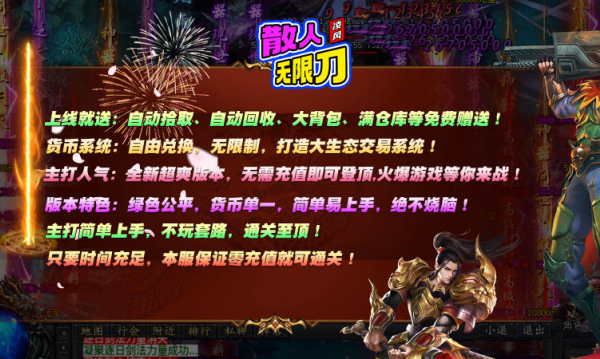 凌风散人无限刀是一款完美复刻经典传奇风格的热血手游!游戏继承传奇核心玩法,打造原汁原味的复古体验。独创"无限刀"攻速模式,带来极致爽快的战斗手感。丰富的技能组合与战术搭配,让每个职业都能衍生出多样玩法。无论是单人挑战BOSS还是组队征战沙巴克,都能让你重温当年兄弟并肩作战的热血青春!